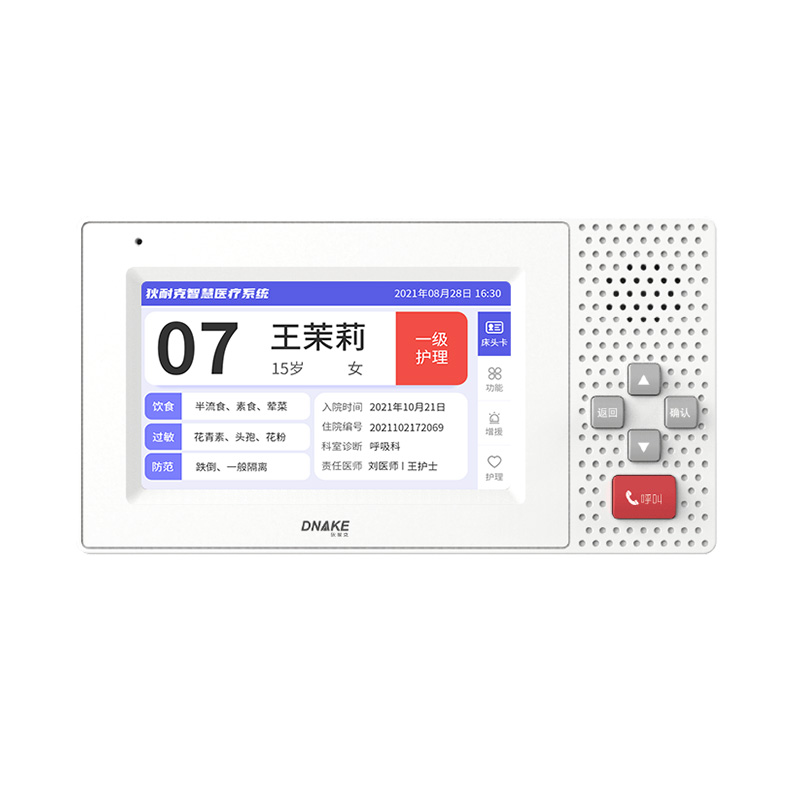安裝在病床頭的交互設(shè)備機,代替?zhèn)鹘y(tǒng)紙質(zhì)卡。產(chǎn)品支持呼叫對講、為住院患者提供病例查詢、狀態(tài)自動提醒等護理需求等。