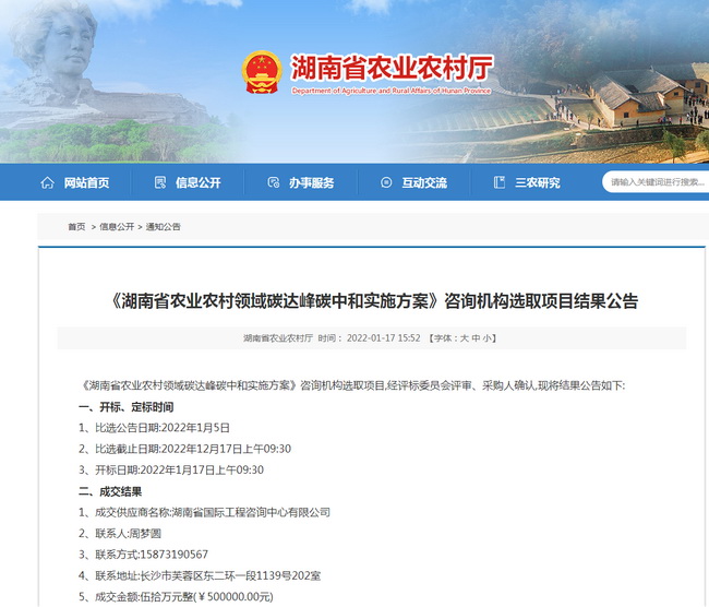 2022年1月17日,經(jīng)過與眾多投標(biāo)單位的激烈角逐,省咨詢公司憑借豐富的咨詢經(jīng)驗(yàn)、強(qiáng)大的技術(shù)團(tuán)隊(duì)、過硬的成果質(zhì)量和完善的服務(wù)標(biāo)準(zhǔn)順利中標(biāo)省農(nóng)業(yè)農(nóng)村廳《湖南省農(nóng)業(yè)農(nóng)村領(lǐng)域碳達(dá)峰碳中和實(shí)施方案》項(xiàng)目,項(xiàng)目中標(biāo)金額為50萬元。